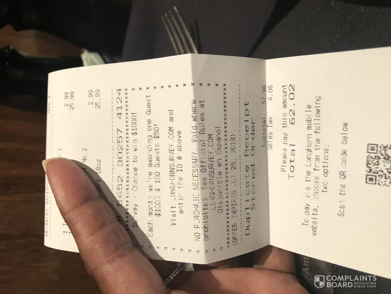 I ordered two take out dinners on July 25, 2018. My bill was $62.++. I gave the cashier my debit card, as she gave me the receipt to sign, I requested a second loaf of bread. I was charged an addition $1.12. If I had eaten in Longhorn I would have been able to get an extra 1 or 2 loaf upon request at no extra charge. I found the charge to be inappropriate.
