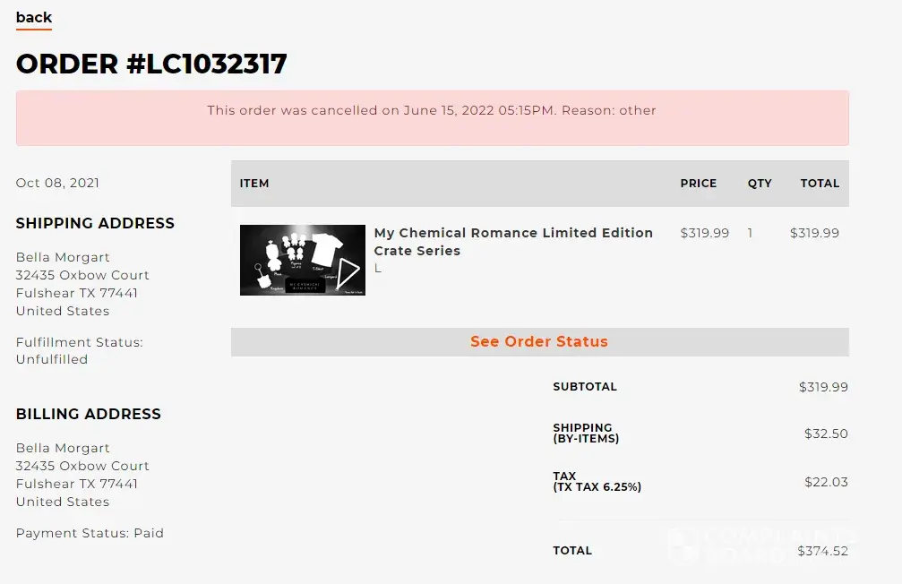 I ordered the My Chemical Romance Exclusive Lootcrates and I have not received anything. These were ordered in October of 2021 and were canceled but no money has been refunded to my account.