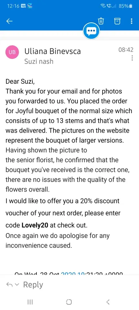 My pictures of communication explain my issues and I am ready to approach Trading Standards for false advertising. Nowhere in the small print does it state the picture of the bouquet advertised us for the larger bunch nor does it state an average stem amount. I understand this varies by design . If that is so then it should be declared in each one