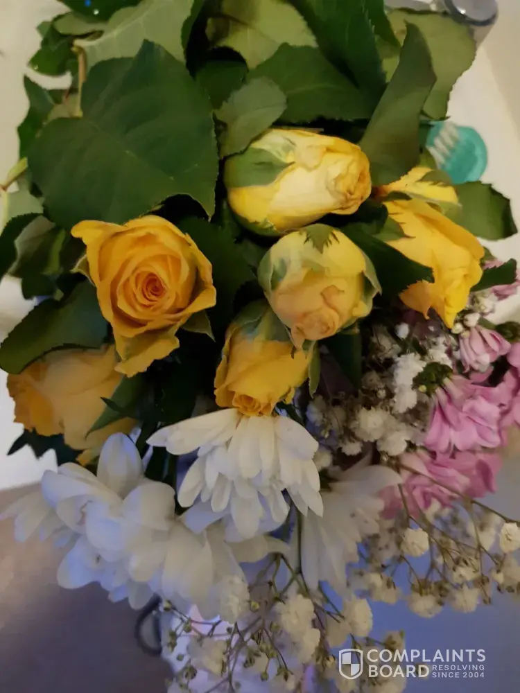 The flowers arrived in a disgraceful state, a small bunch put in a large cardboard box. They were held together with a bit of sellotape and most of the flower heads were broken. There was no sachet of feed and the card was very poorly done.