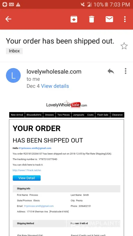 I Robin Pino made a order on Sept, 1, 2018 an never received my order. I have bin back an forward about his matter . I contact PayPal an they stated the sender sent the package to my address witch is 5476 Riverbreeze Ct. Jax, Fl. 32277 an that the united state postal service for my area delivered the package on Sept 29, 2018 . But the address the postal services stated the sender sent it to was a different address from my address. And I never received my package from Lovely wholesale for the amount of $75.09 . For any more Question I can be reach at [protected].