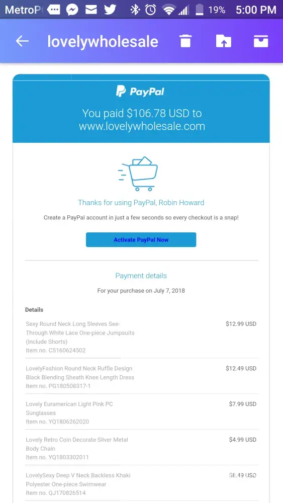 I purchased three items from the loveleywholesale site, which are two bikin suits and one dress. I have received an email about a payment when it was paid in full and only has two items not the three i've purchased. My order number is o2018031974186 and also took screen shots of item and the total that was paid in full. Thank you and have a great day