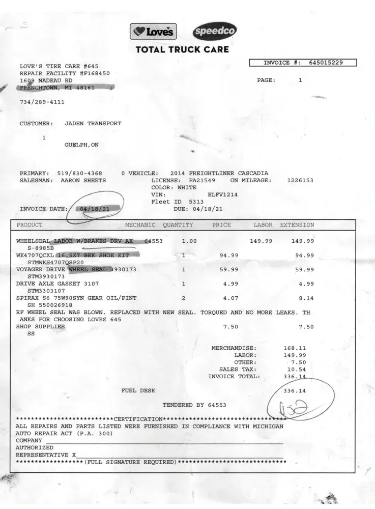We get Wheel Hub seal Repaired at one of your Location in Michigan on April 18, 2021. Still under 90 days warranty we get Re do this job on our Local shop in Canada jun 22, 2021. Because there was no choice to move your Location back 2-3 hours Drive.