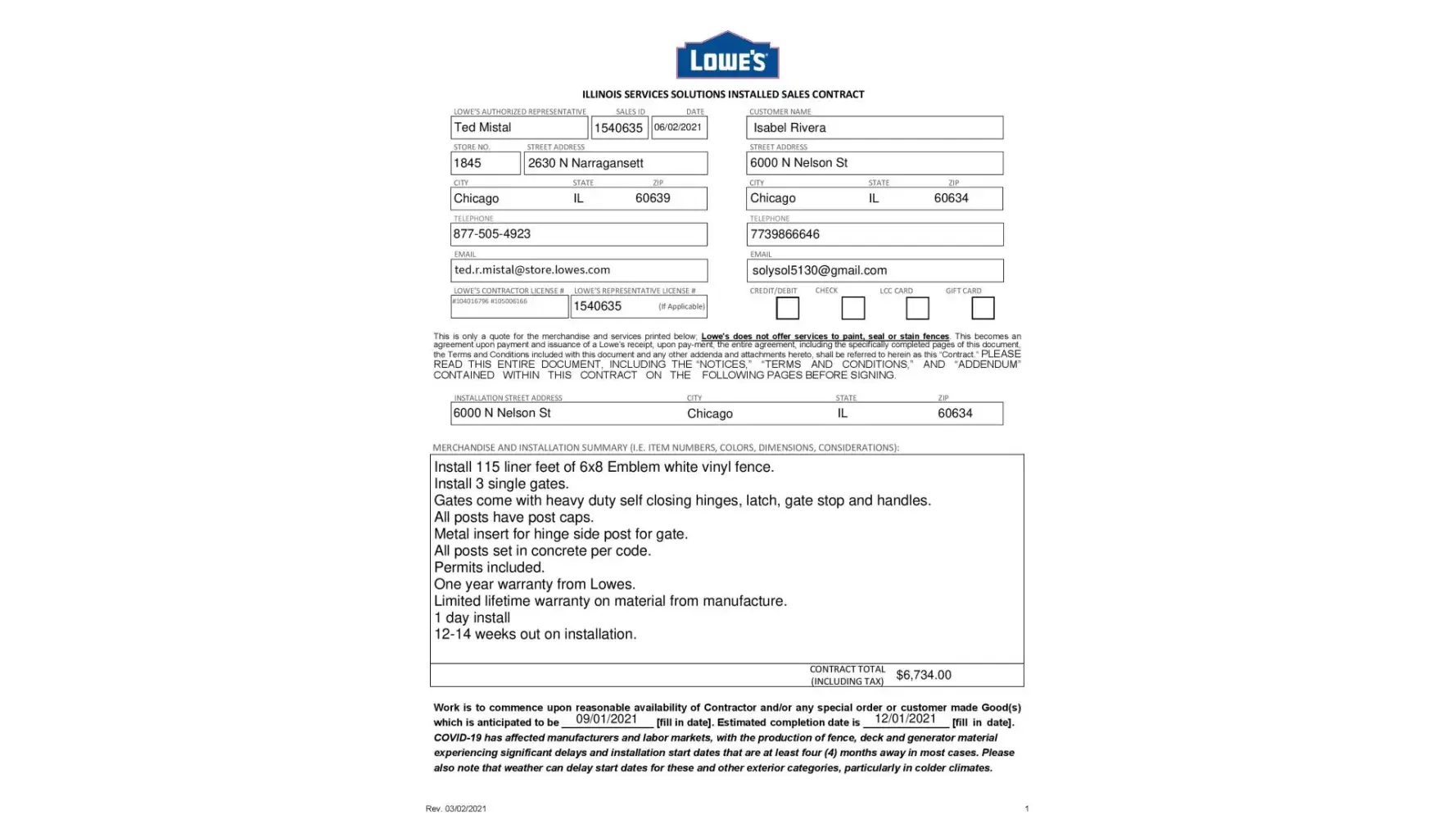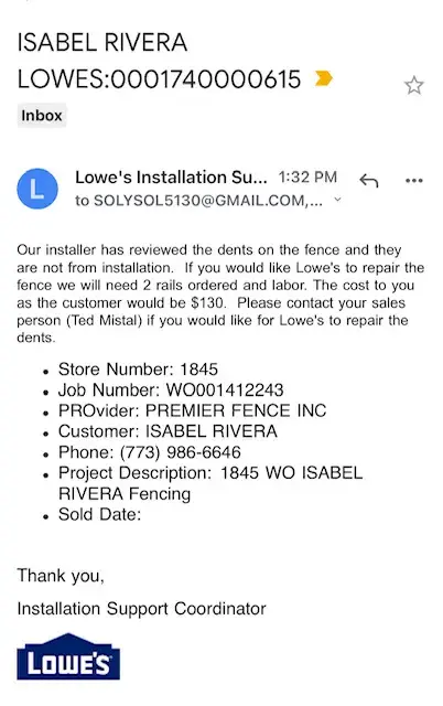 I order a emblem white vinyl fence on 6/02/2021 and i had to wait until they came to install it. Over 14 weeks to get it installed. I went to the store to have the fencing repaired. They gave me a date to come out to give me an estimate of how much it will cost to have it repaired. Lowe's gave me a date of jul 14, 2023. From 1 pm. -6pm.Was consultation day. No one showed up i call ted mistal and said that they could not order it. He said i have to call the installer at [protected] i call and they say that they work only for lowe's so the only way they would come is if lowe's ordered them to come. I ask for the corporate number and they gave me [protected] and no one answered. I am very mad because they were fast to take my money when i made the big order but now they don't want to help me to get it fix i am going to pay to have it fixed. I will never buy anything from your company again and i an telling all my friends and family not to buy from you. I hope you can do something for me that was a lot of money that i spend on the fencing and i don't want to leave without fixing it.
