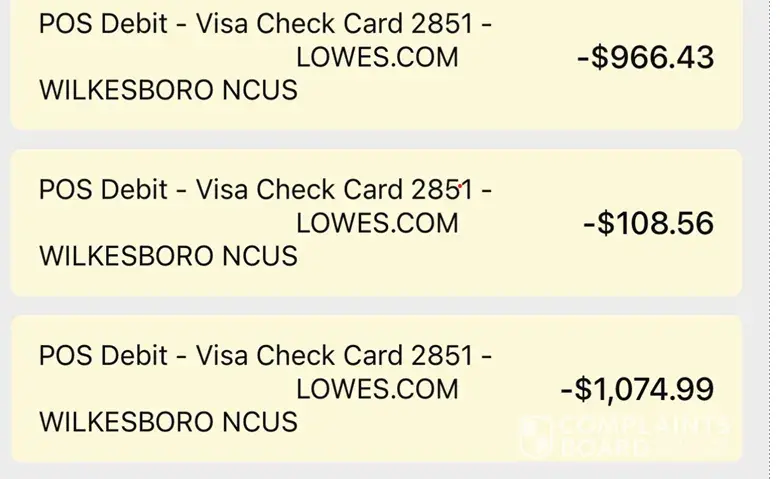 Lowes placed a double hold on our account for our purchase. This is not acceptable. I spent over 2 hours on the phone with no resolution or any explanation that makes any sense. The order number is [protected]. When I called, I was told that it is your policy to make a double hold but this ties up my personal funds! Sure, I owe you, 1074.99. When that one hold is placed, that's all you should place. But, no, you have additional holds of 966.43 and 108.56 as well. You have tied up a significant amount of money that I need to pay my bills. Money that was never owed to Lowes. You place a hold once, and that's it. That is criminal. I will be reporting everywhere! I get the charge will come off later, but that does nothing to do with the available balance that reduced by your criminal policies. This is temporary theft!