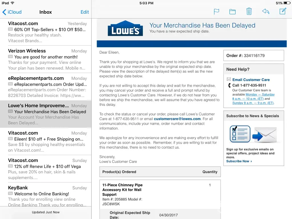 I am attaching a picture of my receipt and the offer I got by mail. All I want is for Lowe's to honor their mailed offer and save me the pain of returning my entire purchase and buying it again tomorrow (as they suggested).