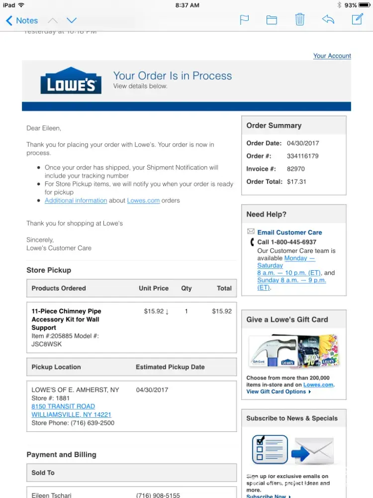 I proceeded to check online to see what store might have it, and found that the Lowes Springville, New York store had 6 of the same item #s at their store. I called and spoke to Matt in the plumbing and heating department, and asked him if he could ship the order for me to the Lowes Amherst store. He said he would, but I would have to wait a couple of days. I said no problem, and he asked for the order #, and I gave him #[protected]. Matt looked it up on the computer, and recognized that their was a difference in price. He said that he would call me back . Matt called me back, and said he could not send it and said that I would have to call customer service at the Lowes Amherst store. Well, I called Lowes Amherst store customer service and explained to the girl there that I didn't cancel my order and that there were 6 items of the same item # Lowes Springville store and why didn't she have the ship it to their store, she just said I would have to reorder it online again and pay the new price for the item . I was shocked, that just because their was a difference in price, I would have to order it again.