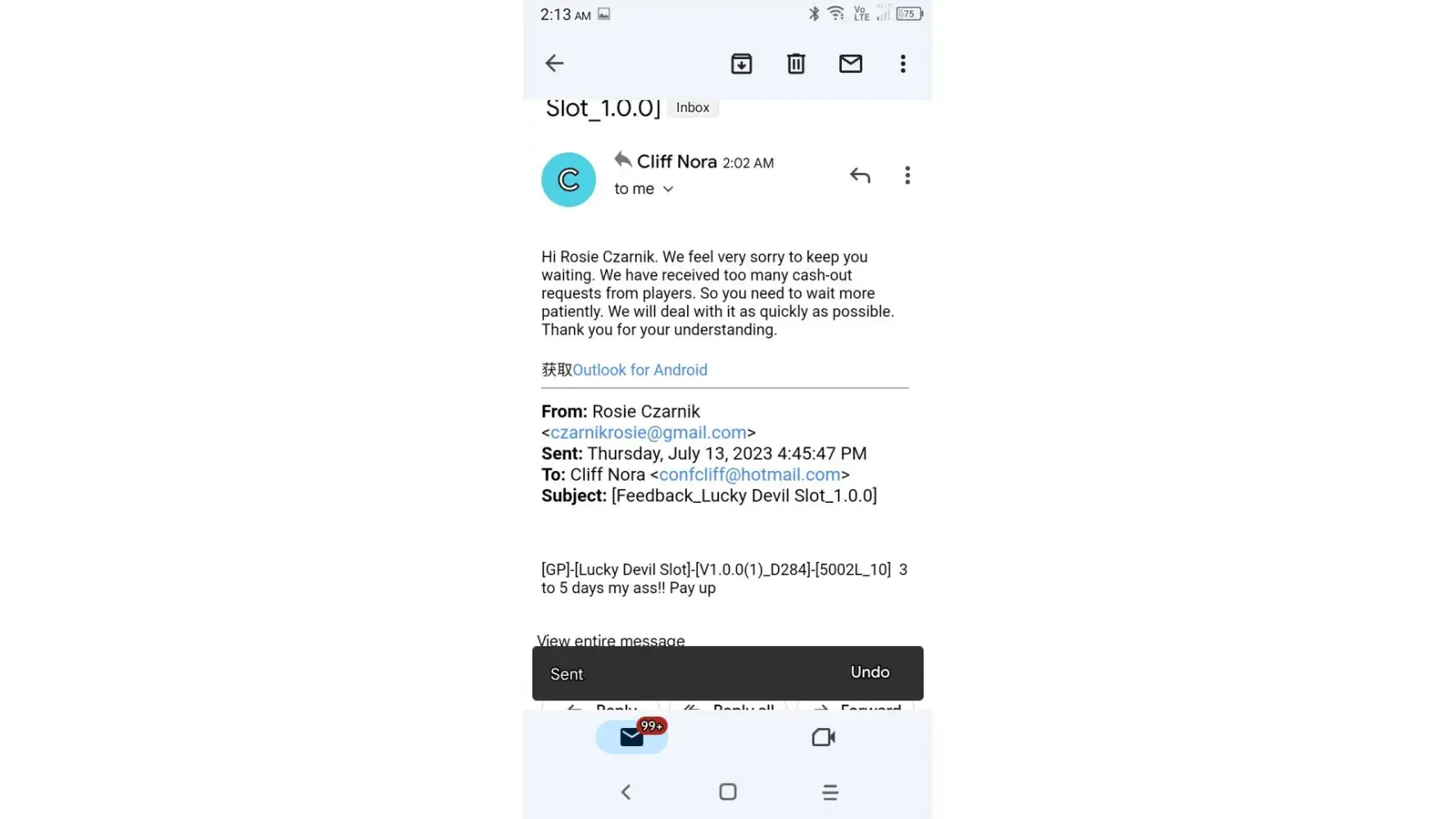Played Lucky Devil Slots game and other games by this same developer for the last four months that were pending in the queue payable to me but have mysteriously disappeared from my Cash App Account and my PayPal Account I've tried emailing them for the last week numerous times and have not received a reply back I've contacted PayPal and they have no pending payments in the queue waiting to be deposited into my account They do not provide a customer Service Number The total amount due me from Lucky Devil is $10000+