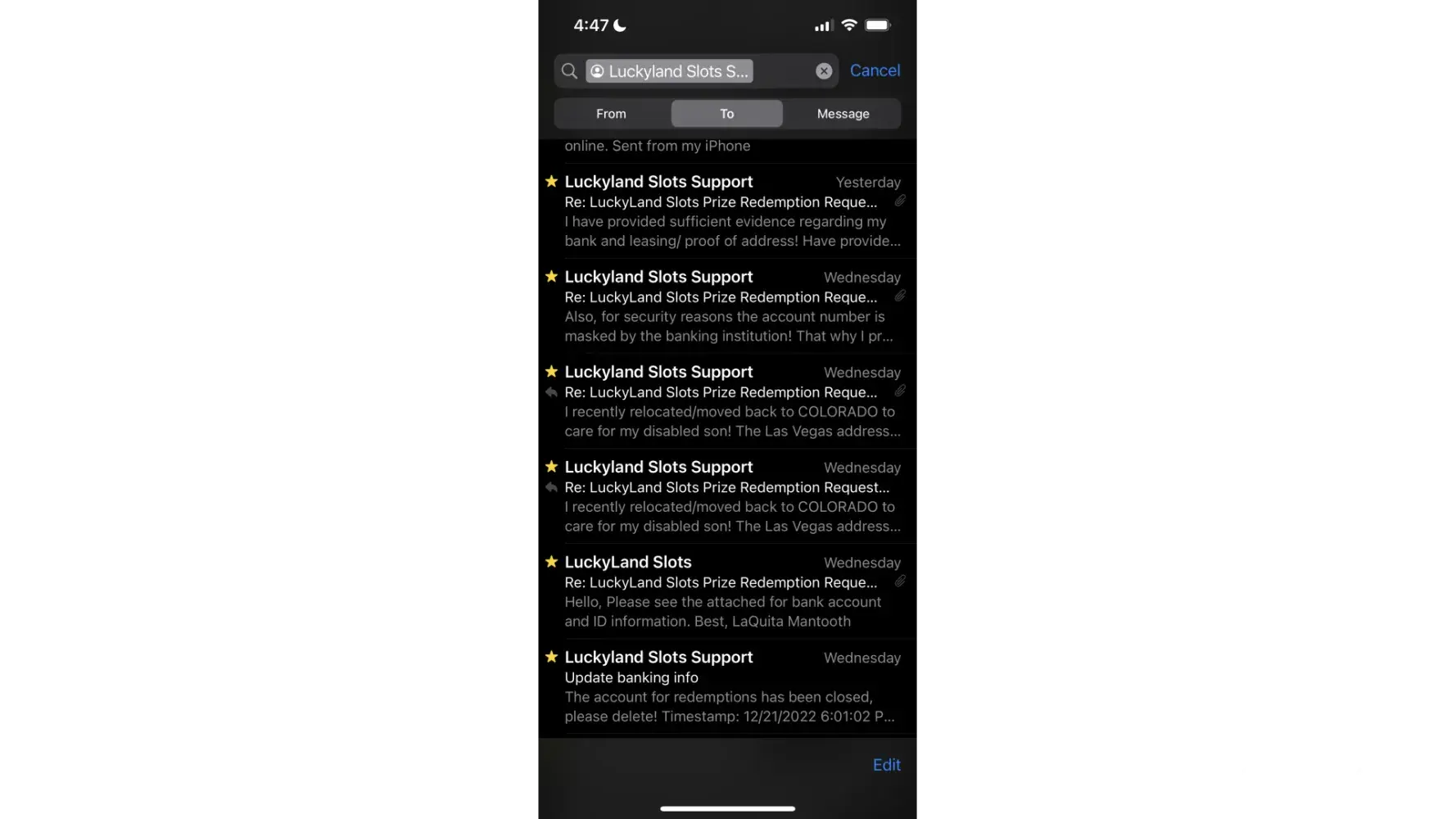 I provided them with at least 5 very official documents (federal loan statements for 22/23 year; my full bank statements from last month; my ID twice; my bank account with matching routing numbers and checking account numbers from online view; and more). They weren’t going to pay me without proving everything under the sun to them, at the end of the day. I had Bank Logos, My name, My address, dates and time stamps, everything clearly outlined. I completely understand where LuckyLand were coming from, but - FUTURE OR POTENTIAL CUSTOMERS - do understand that this process for me was made very difficult unnecessarily and I don’t believe that I will get any funds back - my initial deposit or my winnings.