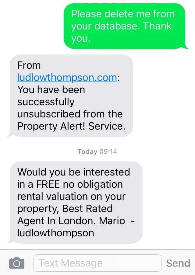 Ludlow Thompson seem to think I might do business with them, so they send me spam texts on a regular basis. Each time I ask them to delete me from their database, I get a message saying I have been deleted, and then more spam text arrives. I've now reported them to the Information Commissioners Office.
