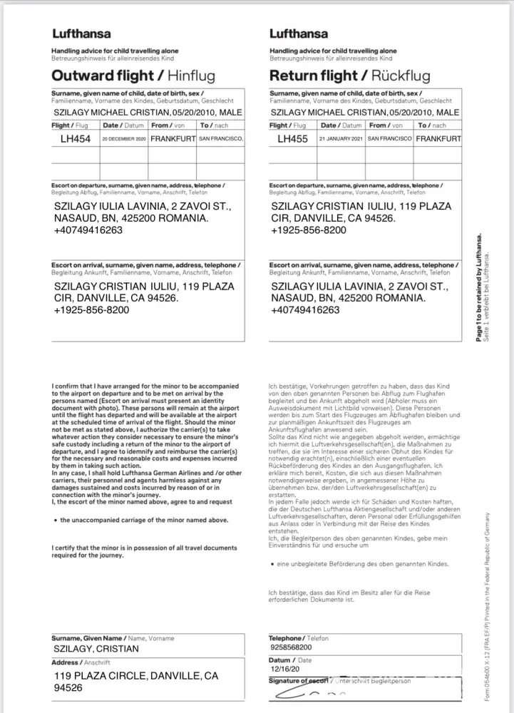 I had purchased Lufthansa Unaccompanied Minor Service for my ten-year-old son to fly from San Francisco to Frankfurt, Germany. My son arrived in Frankfurt and was supposed to be escorted by a Lufthansa employee to meet my niece, who was waiting for him at arrivals. The Lufthansa employee did not take my child to meet my niece nor contacted her at all. Instead, she left his carry-on luggage inside the aircraft and rushed him to his connecting flight. Lufthansa Unaccompanied minor service states explicitly that they need to hand over the child to an adult upon arrival. My child called me several times from the airport to let me know his bag is still inside the aircraft and the Lufthansa lady is not taking him to meet with our niece. Lufthansa employee refused to speak to me at first, but After several attempts from my child, she told me that she won't go back to take my child's luggage from the plane and that she will take him to his connecting flight. Our documents clearly state that my niece will be meeting my child in Frankfurt. At departure in San Francisco, the Lufthansa employees clearly told us that they are not allowed to escort the child during transit and that someone has to meet the Lufthansa escort in Frankfurt. Lufthansa does not offer unaccompanied minor services for connecting flights, only direct flights. I do not understand how the Lufthansa employee can board my child on another flight without informing the adult waiting for him or myself. In regards to his lost luggage, I filed a lost bag claim and called several Lufthansa numbers in Frankfurt airport and also went and spoke to the Lufthansa supervisor at San Francisco airport to report what happened and try to locate my son's luggage. Lufthansa informed us that the baggage could not be found and they are sorry about this. We will like to have our property returned to us, and the Lufthansa escort to he held accountable for irresponsible handling of a minor. Please help us solve this. My email address is [protected]@yahoo.com/ [protected]