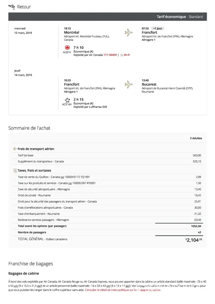 My parents were supposed to leave Bucharest on December 18, 2018 - see booking number Lufthansa UPRLQL in the reservation here up - at 06: 25h with flight LH1423, make a stop in Frankfurt from 2: 40h to fly afterwards for Montreal at 10:05 am with Air Canada flight AC875.