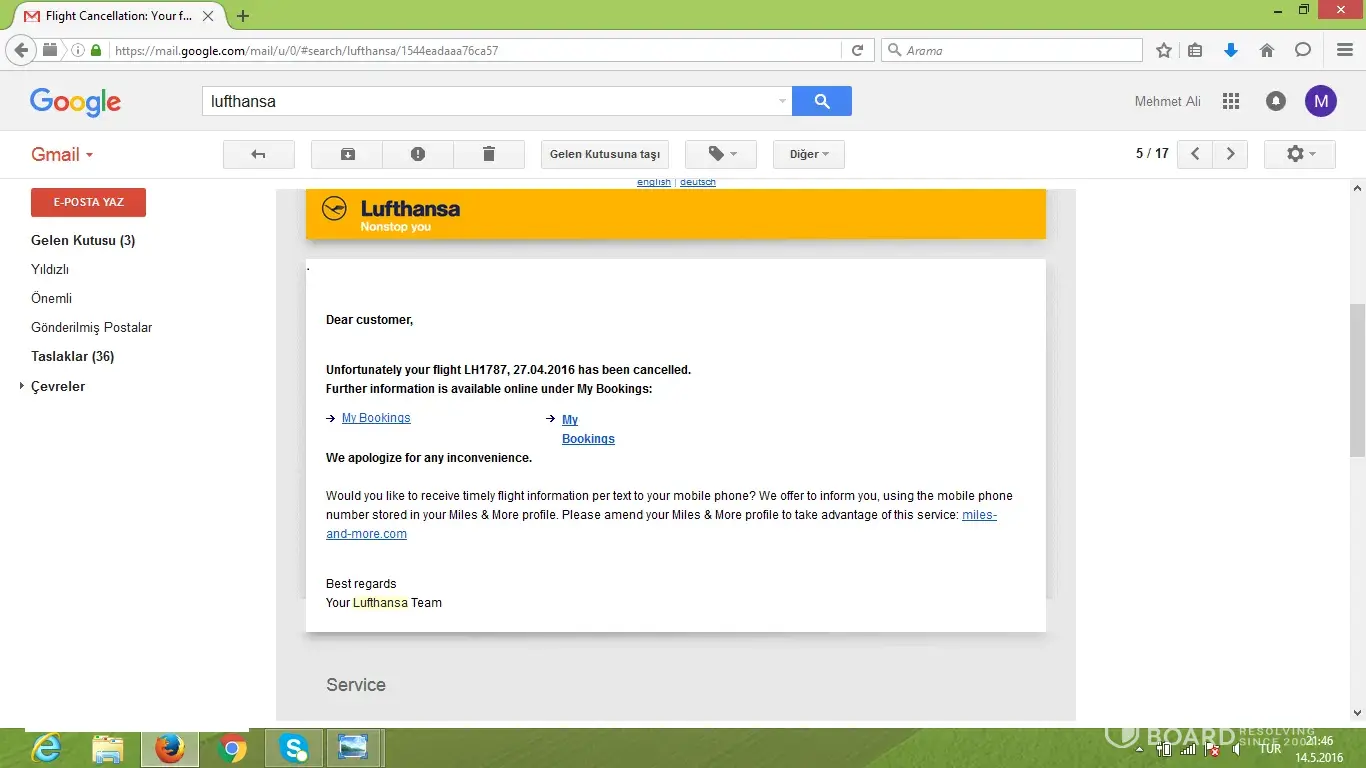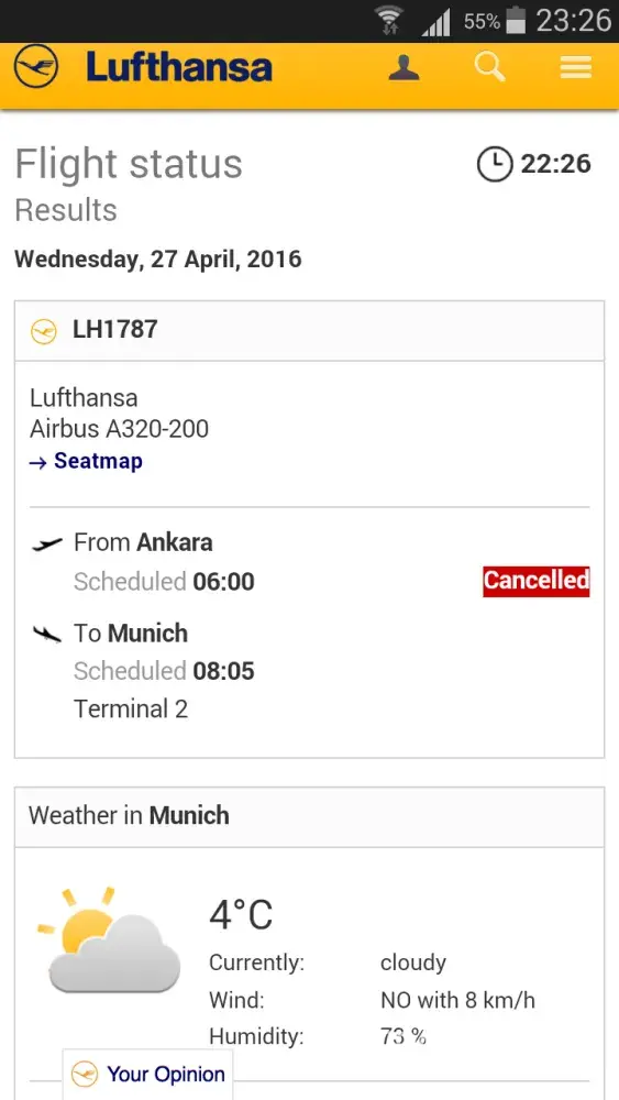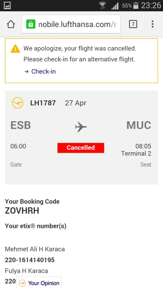 that “unfortunately your flight LH 1787, 27.04.2016 has been cancelledâ€.