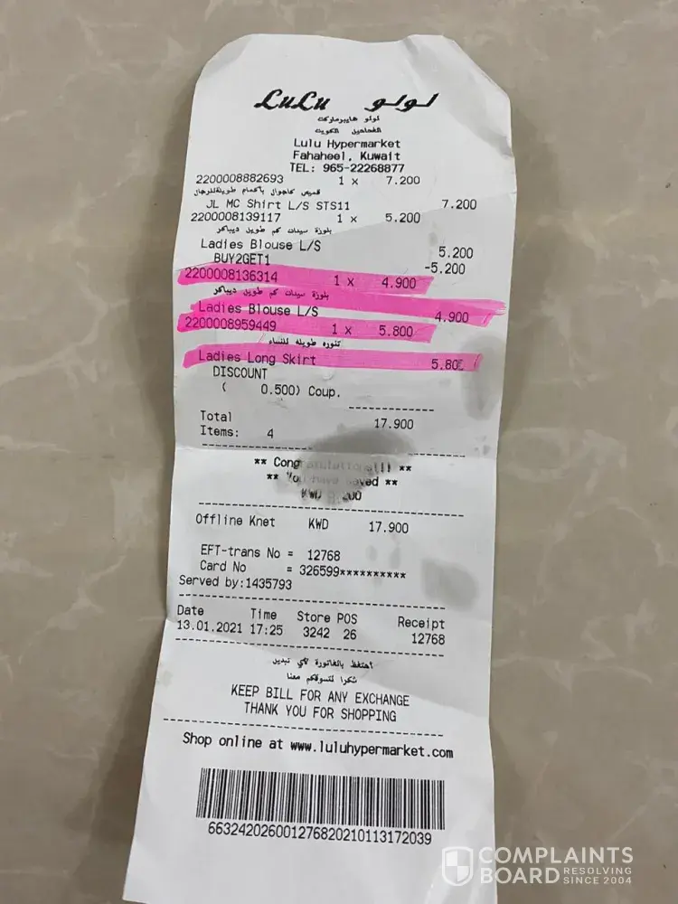 It's not about this small amount of money (small for me, but when u do like that with all staff to everyone, it's big!), but mostly that it makes me feel cheated, that Lulu does not respect her customers, which in turn suggests that shopping in Lulu is not safe.