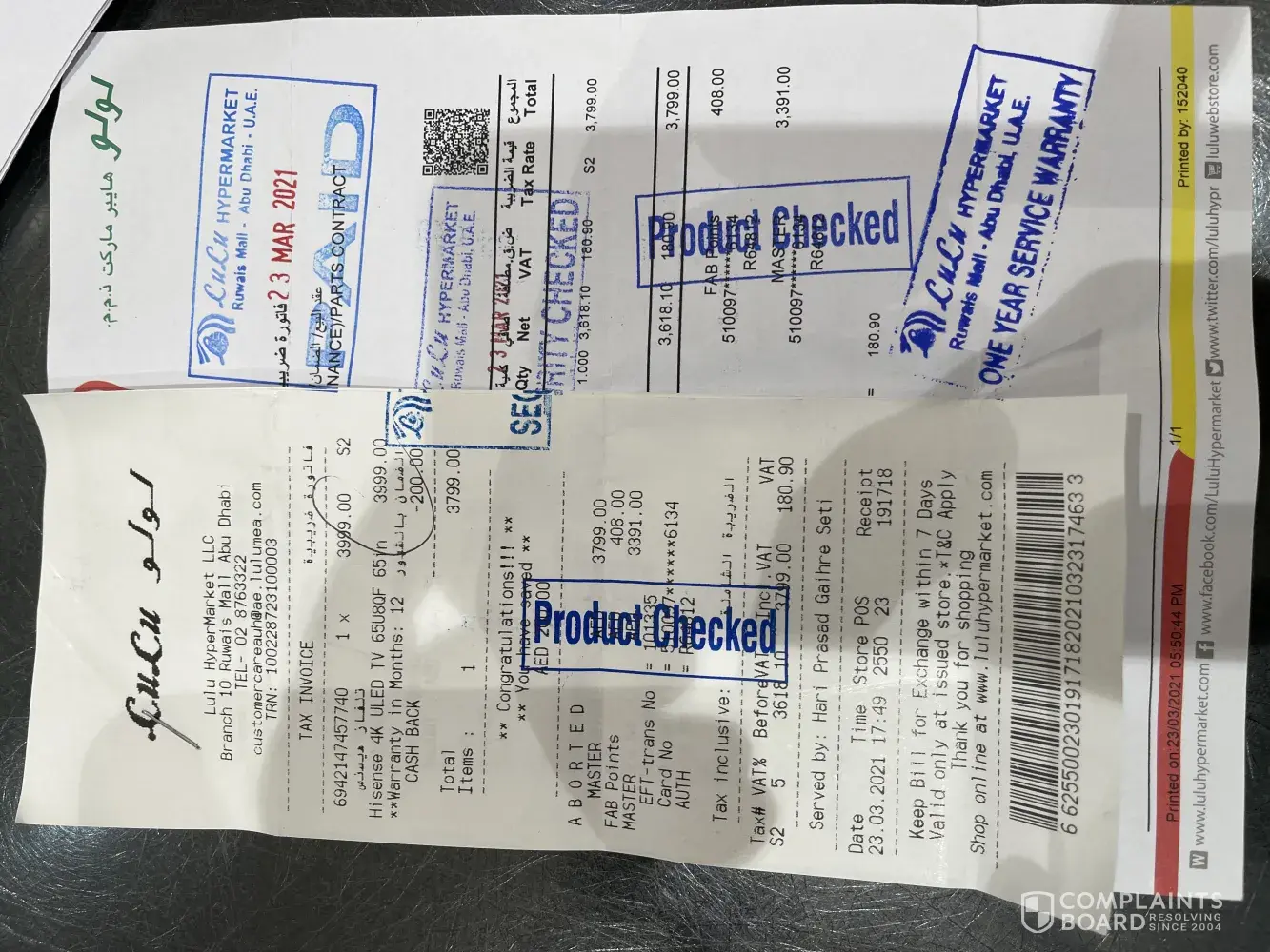 I have purchased a 65 inch hisense 65U8QF TV from Lulu, Ruwais Mall, Ruwais on 23rd March pertaining receipt No. [protected]. TV having default Picture jurging and motion blur problem. It problem occurred again and again. It also puts badly effects on eyes and you cannot watch the TV continuously. I am totally unsatisfied and exchange with other company TV.Yesterday I bring back the TV on the same store but there response is not good. Customer care staff trying to prove me layer and wrong instead help me. I will request you please look into the matter seriously and resolve my issue.
