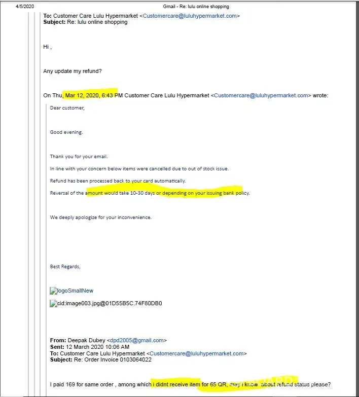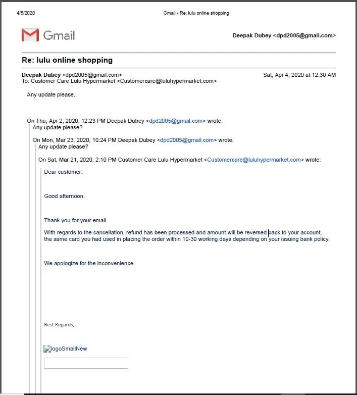 I have been following for 20-25 days but so far i could get a refund. Could anyone plz help. Above all conversation happened over "Customercare@luluhypermarket.com",