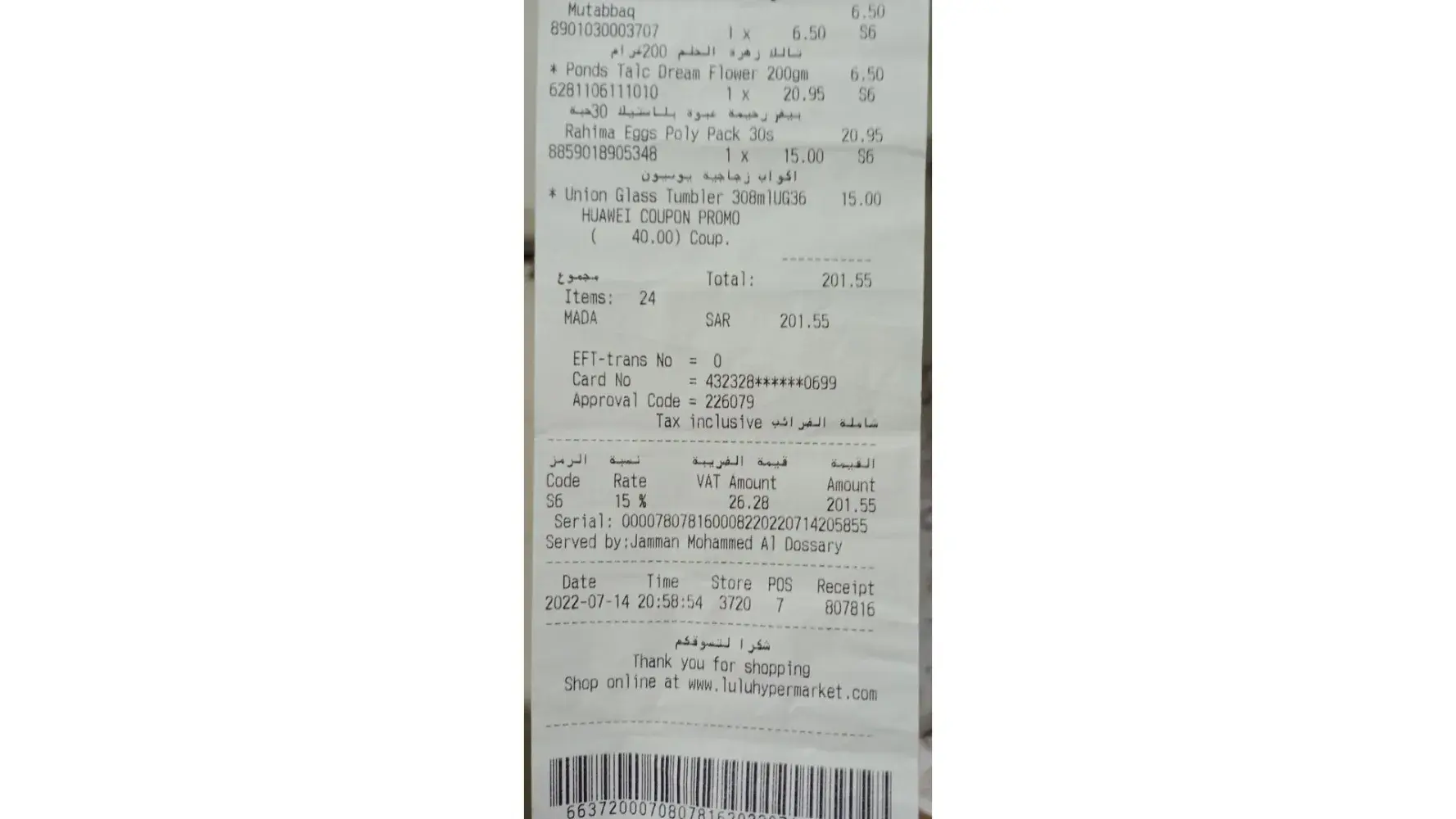 I have visited Lulu store 3720 on 14/07/2022, and time of billing is 20:58:54, receipt number 807816, POS-7.