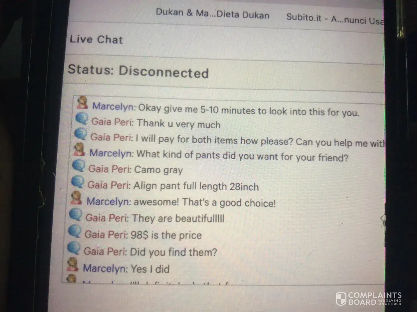 Yesterday I bought a pair of pants being helped by a live chat person. Then when I checked my order everything went wrong. I specifically asked for camo pants and she just picked a grey pair and a camo define jacket and also there she pickeda wrong one.im going to send you the picture of our conversation. The order number is c9132131815 .I called back customer service number and they apologies, canceled my order and for the discomfort caused she told me she was going to send a gift voucher that was never received.