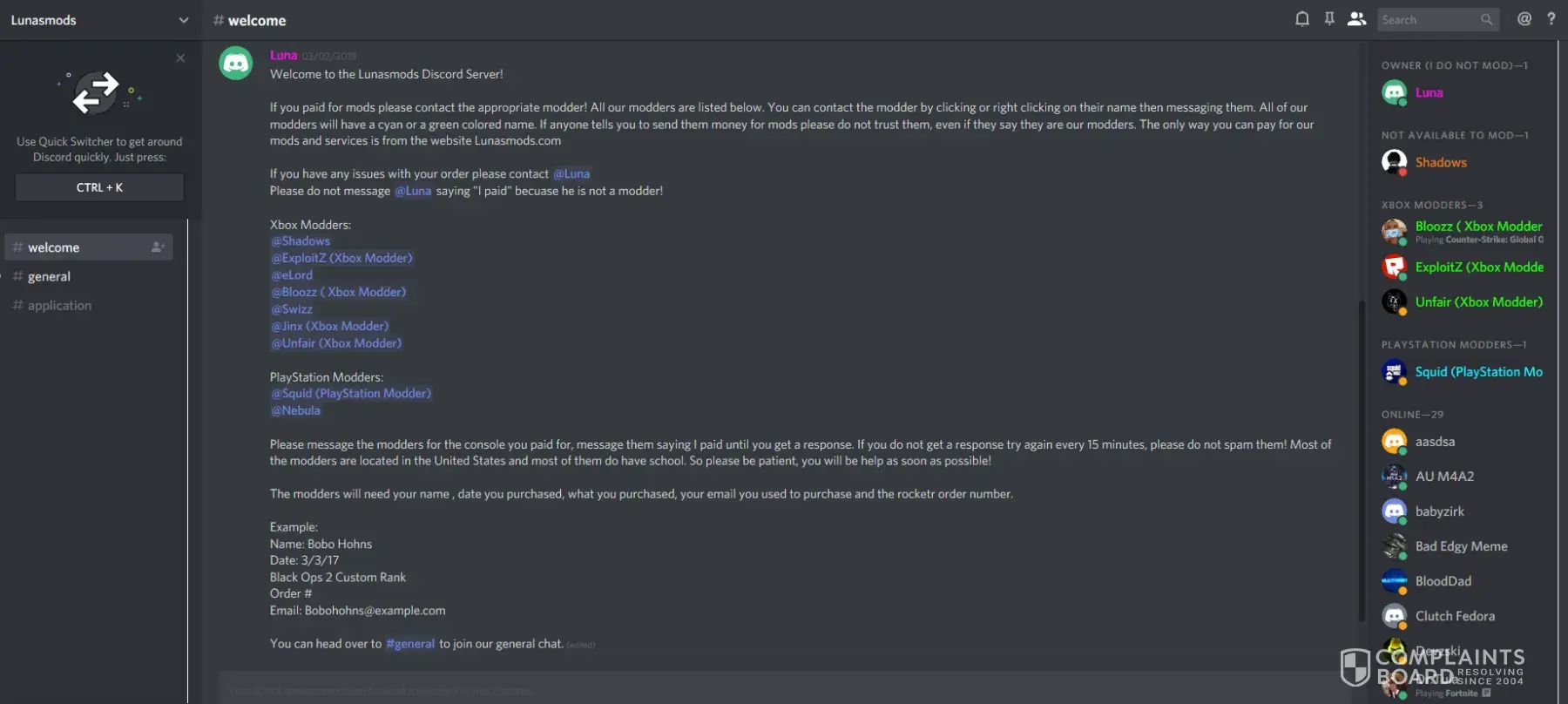 I have purchased a Black Ops 2 custom rank the other day... Most of these reviews do not seem to be true. I can provide proof if needed that I placed an order and got what I paid for. This is how his website works.. When you place an order all the information you need to know gets sent your email on the receipt. On this receipt it tells you to go to two different links, one for xbox and one for playstation. These links are not visible on the website and only customers can see them on their receipt. The owner of Lunasmods does have two discords. One for support, to message him directly for help and another for his customers. The one for his customers, has all of the modders in it as well. You simply join the discord and message the modders to get what you paid for. I will be posting some images of the discord the customers only have access to (the link to join the discord is on all receipts).