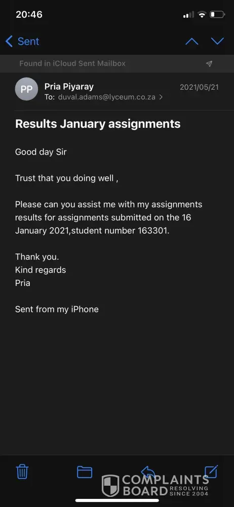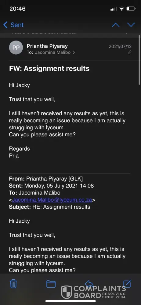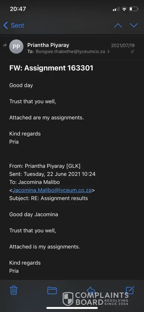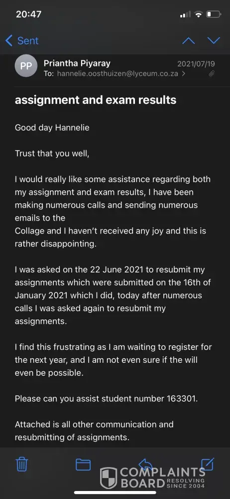 I started the process of applying and registering at the college back in early February this year with a student advisor by the name of Natalia Davids she eventually sent me the forms after about a month and a half after I enquiried about the Grade R course she sent all the forms I filled them and sent back I sent follow up emails followed by phone calls trying to get feedback on my application eventually by end of March after literally hounding them for feedback either she was never at work or she never replied to my emails but my application was finally approved and awaiting payment for the registration fee of R4000 8 paid on the 30th of April and sent proof on Monday the 3rd of May and waited for feedback I left it that week on Friday I sent an email requesting feedback for acknowledgement to advise me if she has received the proof of payment no reply I phoned the college she was not at work but I was advised to wait as the process was delayed due to the number of students applying I should give it a week that was last week Friday while waiting for the week to finish so I can follow up next week I received an email from another student advisor named William he sent me forms of the same process of application that I have done already I replied to his email telling him I've already done this and paid I'm waiting for feedback for the registration he an automatic response came stating he was busy he'll get to me initially I got worried that what is going on now as it was later in the afternoon I waited for the following day I phoned and asked for Natalia my student advisor as usual she was not in I raised my concerns and refused to go without an explanation I was promised that her supervisor will contact me I waited and no call was received I phoned again today the 13th of May 2021 asking for her again I was transferred and the call was ringing and no answer and it was dropped I phoned again really frustrated this time told the person helping me that I'm not taking this I'm tired of this run around she told me to hold she tried her and got back to me telling me she doesn't know where she was not sure if she was on break or not she took my details and promised as soon as she comes back she will call me and still nothing now I'm worried If I was scammed or not I paid so much money and 13 days later no one has any answers for me please help either refund me or get me registered so I can finally study after almost half the year trying to enroll and register. Seriously Lyceum is unprofessional and really frustrating