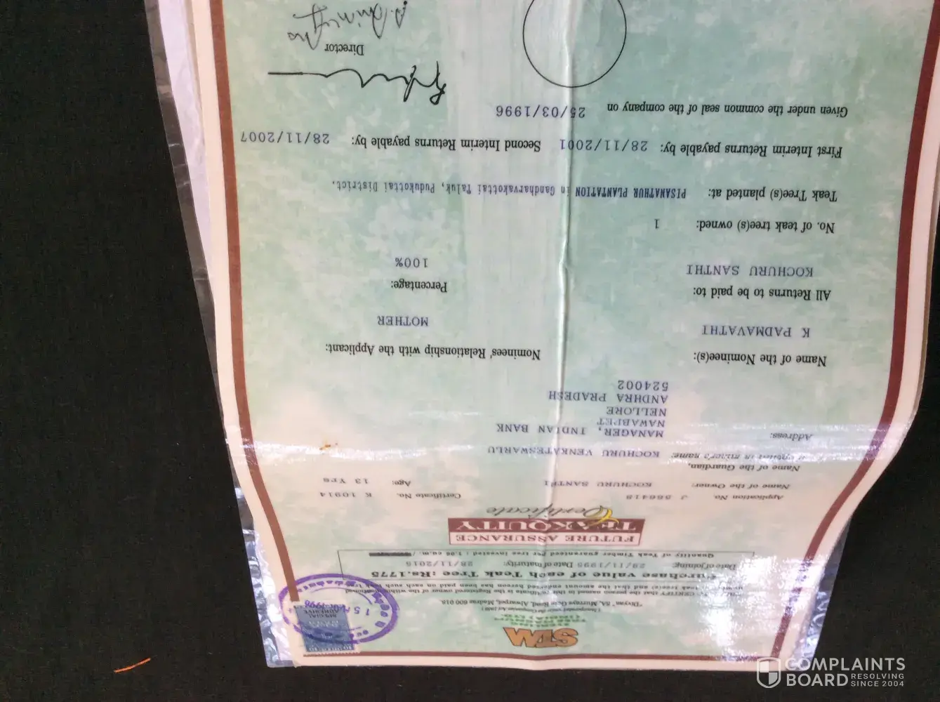 I had invested rs 7100 for 4trees @rs 1775 each on 21/06/96. certificate no k 28850, k 28849, k 28847, k 28848. so far I have not received returns due on2002 & 2008 &no information about co' s status.
