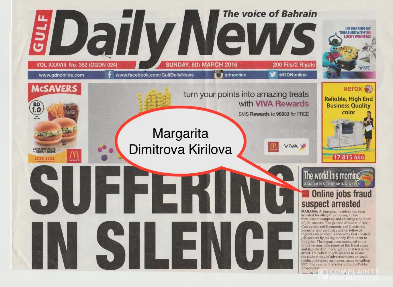 Margarita Dimitrova Kirilova - office of this scammer is confirmed at 76 The Breeze Apartments, Building 2337, Road 2830 Al Seef 0428 opposite Seef Mall in the gray MAASTER Building...opposite Ramez Grand Suites she parks on level 2 - Gray BMW in the corner parking