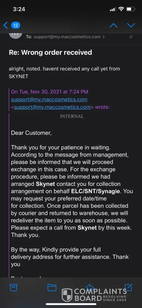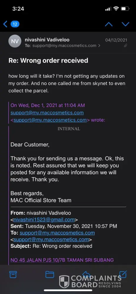 I placed an order in November 2021 for ONE item. It is not December 28th and no sign of it anywhere. I phoned MAC on Nov 23rd and the person helping me promised she would do a re-order and ship it overnight to me. Six days later, I received an email from MAC saying my order was shipped. I went to check the status and it said it could not find that tracking number. So I phoned MAC last night, 12/27 and she said she sees the label was printed but it has not been shipped yet. Why would I receive an email from MAC saying it was shipped when it hadn't even left the factory yet? What is the problem here?