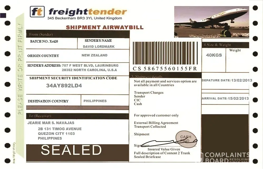 AKO DIN MI NA KILALA SA PERSON .COM NAME DAVID LORDMARK AT PINADALHAN NG VALENTINES GIFT...TAPOS NAPUNTA SA DAVAO AIRPORT KAILANGAN DIN AKO MAG SEND DAW NG 12, 500 FOR CLEARANCE TAX...ANG NAME NAMAN NG PAPAMGAP AY SI GLORIA SAN JOSE .TAGA BOC DAW CIYA NG DVAO AIRPORT...THEY USED FREIGHTTENDER ITO PA MUKHA NG AIRWAYBILL...PARANG TUTUO ...PERU IM SMARTER...NG SABIHAN KO NA PUNTAHAN KO AT DYAN NA AKO MAGBAYAD NG PERSONAL HINDI NA NAG REPLY...KAYA DUDA AKO NA SCAM NA TALAGA..SANA MAGING ARAL SA MGA IBA PA NA WAG KAYO MANIWALA BASTA BASTA ...LAKIP KO DITO SAMPLE AIRWAY BILL PARA MAGING ALARM KAYO..