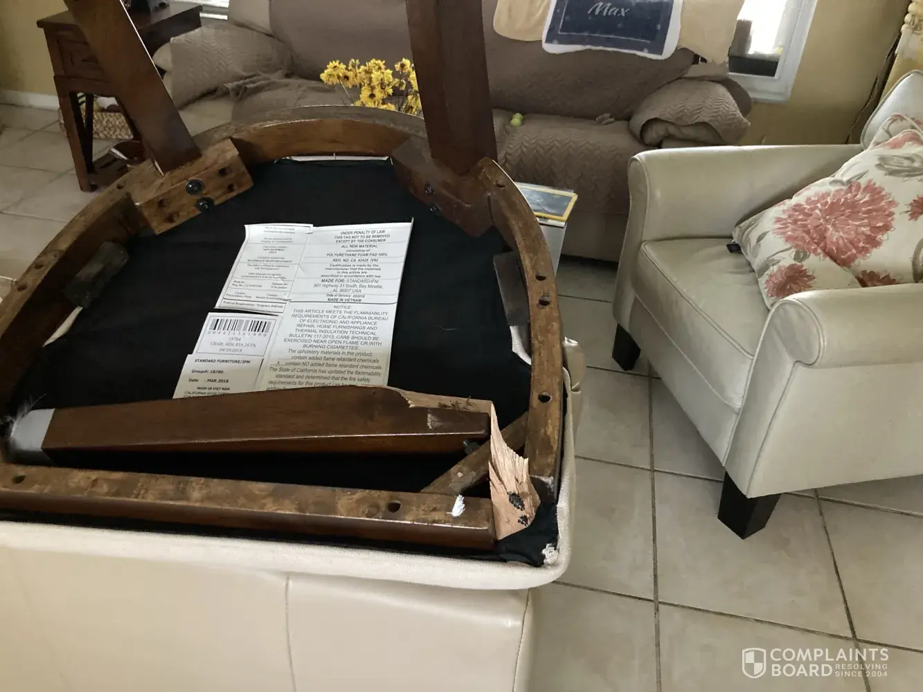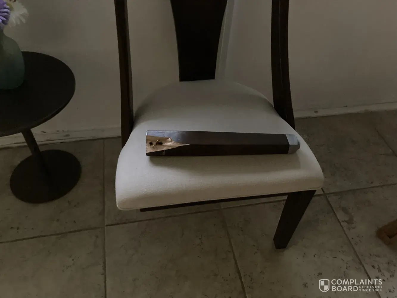 This past Friday, one of my guests was sitting on another dining room chair, from the same set, and the right front leg of her chair broke off. (Photos attached).