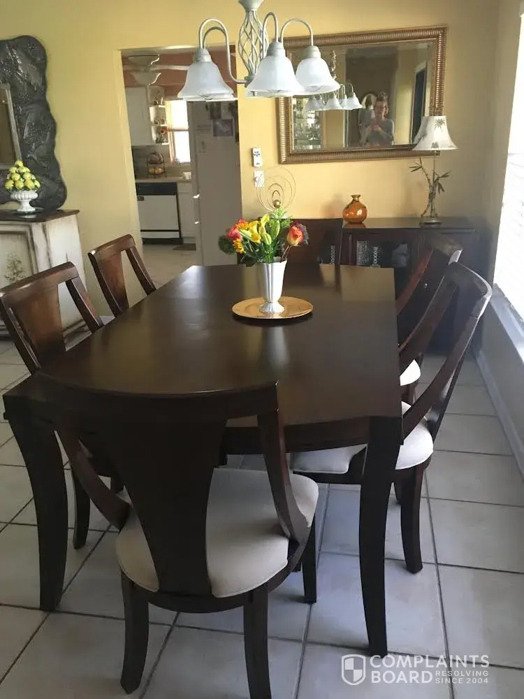 I purchased a dining room set in February of 2019. In October 2020, I was sitting with friends on one of my dining room chairs and the rear left leg of my chair cracked and came off completely from the chair body. I took the broken leg to The Gardens Macy's store where it was purchased and was told the warranty has expired and there was nothing they could do. I found a furniture repair man and had the leg installed back on the chair at a cost of $150.00. Unfortunately, however, because of the way the leg broke off, the chair leg is slightly shorter and tilts when sat on.