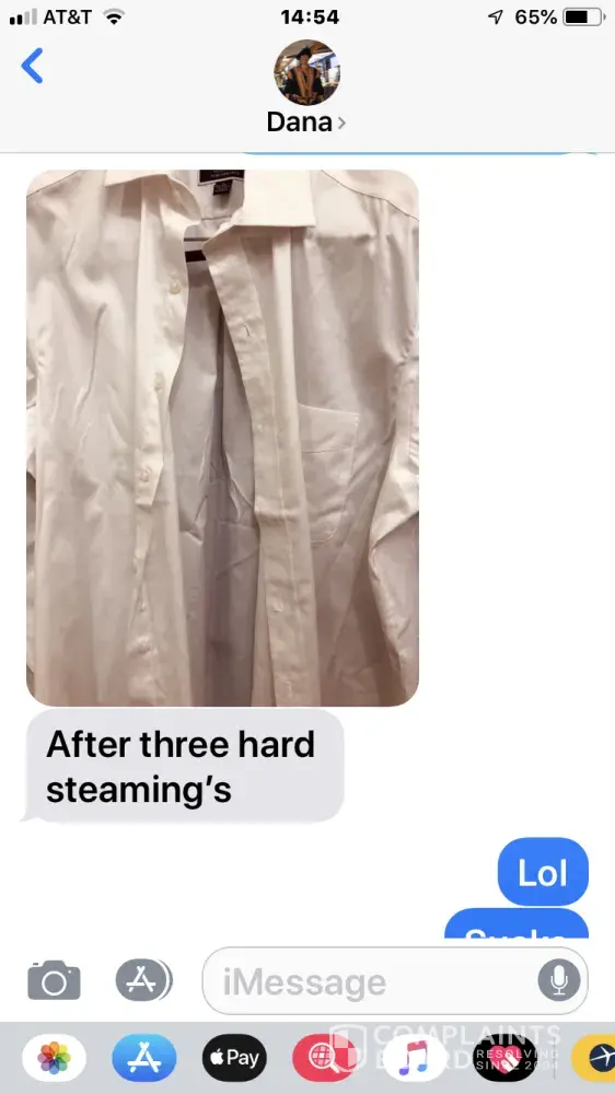 Here's the text that my husband sent me from his hotel room saying he couldn't wear the shirts, and the receipt.
