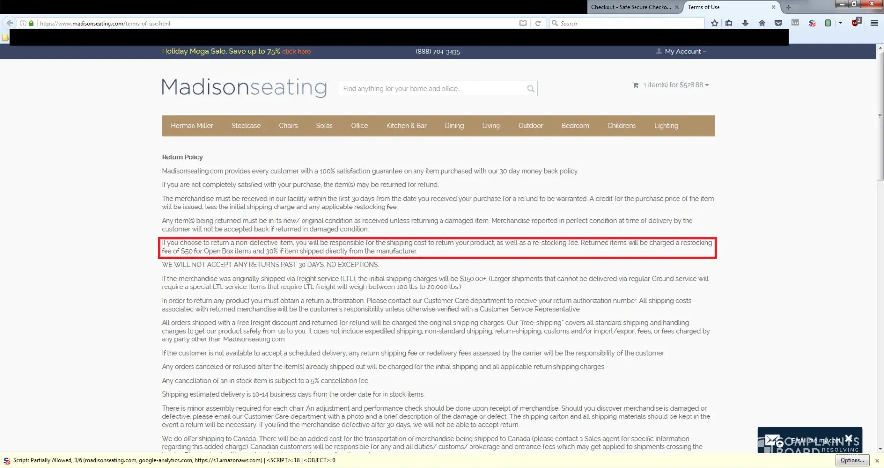 I called to complain today, and they told me that I had clicked a Terms of Use Agreement when I bought the table. They also said that they had sent me an additional email with the Terms of Use after I initiated the return. So, legally, Madison Seating was covered.
