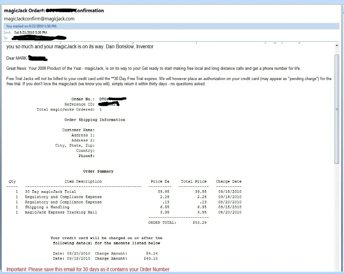 Back in June 2008, I ordered 2 MagicJack services from Magicjack.com who guarantee a 30 day examination period, however, they fail to provide any return shipping address with any of their correstpondence and, disable any buttons on their website to enable a return "within 30 days",