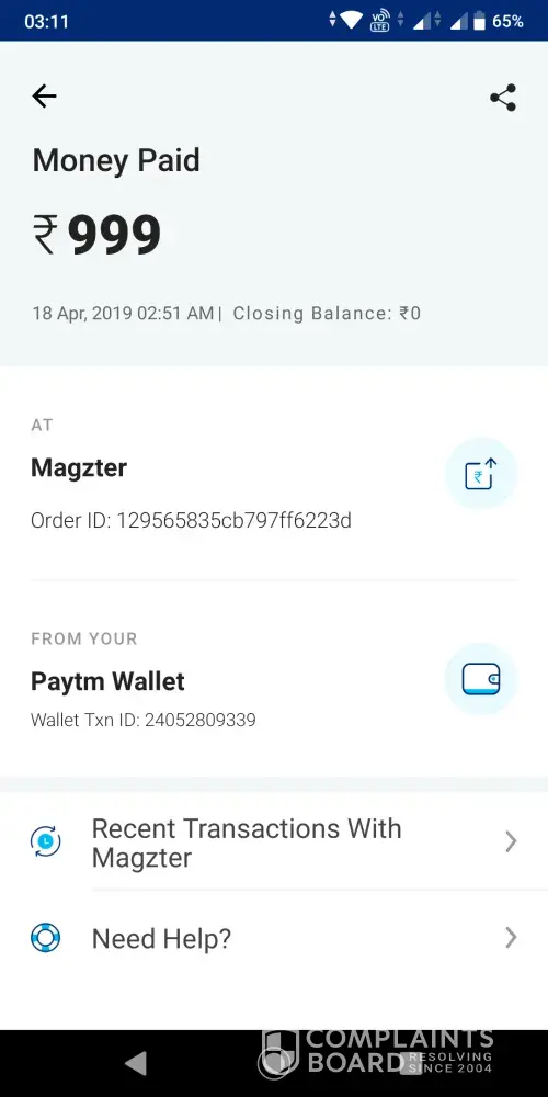 I paid through paytm for my magzter gold RS 999 membership but the order failed and Money debited from my paytm account, then I bought it making a new account which was successful but my previous failed order refund is not given yet, it's really a scammer that u are looting my money, refund my money back cheaters, see the ss below for transaction details and refund my money back.