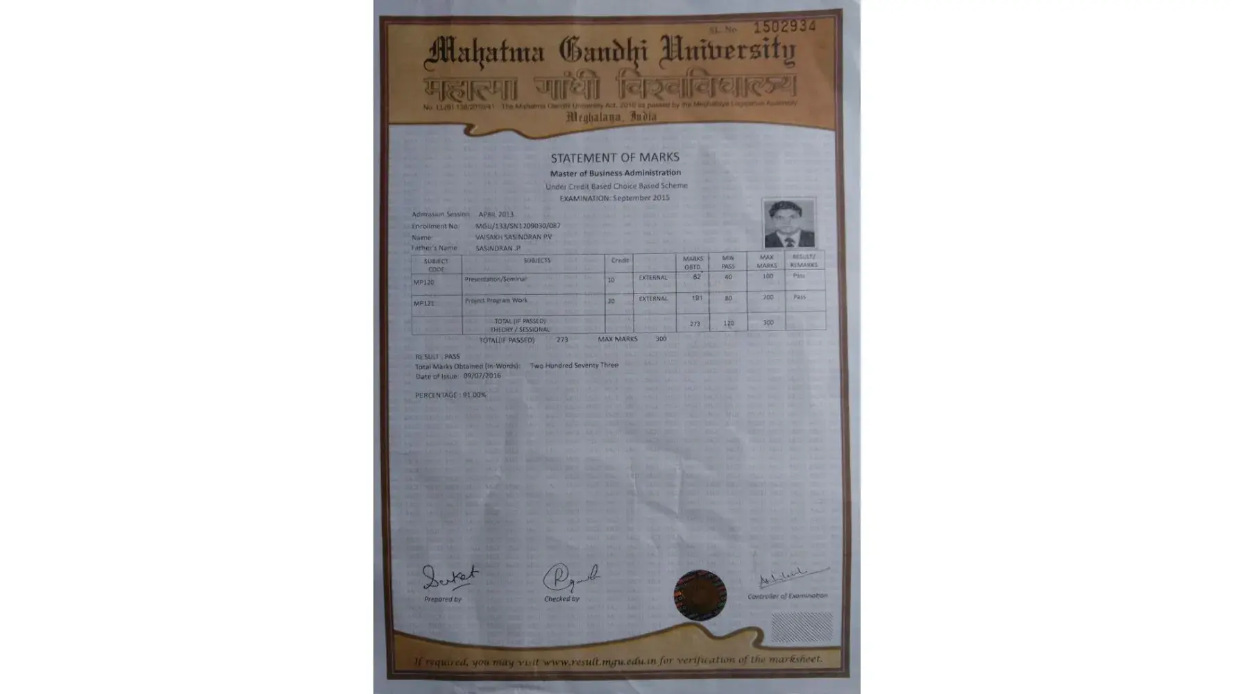 Mahatma Gandhi University Quality of consolidated marksheet certificate.