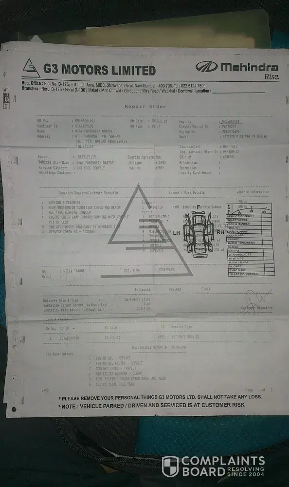 Mahindra - G3 Motors — The complaint against mahindra g3 motors kandivali west mumbai. Related papers