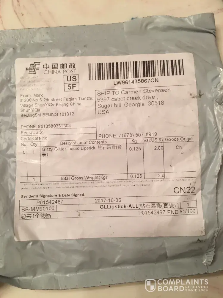 I ordered glitter lipstick on 13 October and apparently it is still in customs in China where it has been since 25 October. I have asked for a refund. Having no joy. They are definitely con