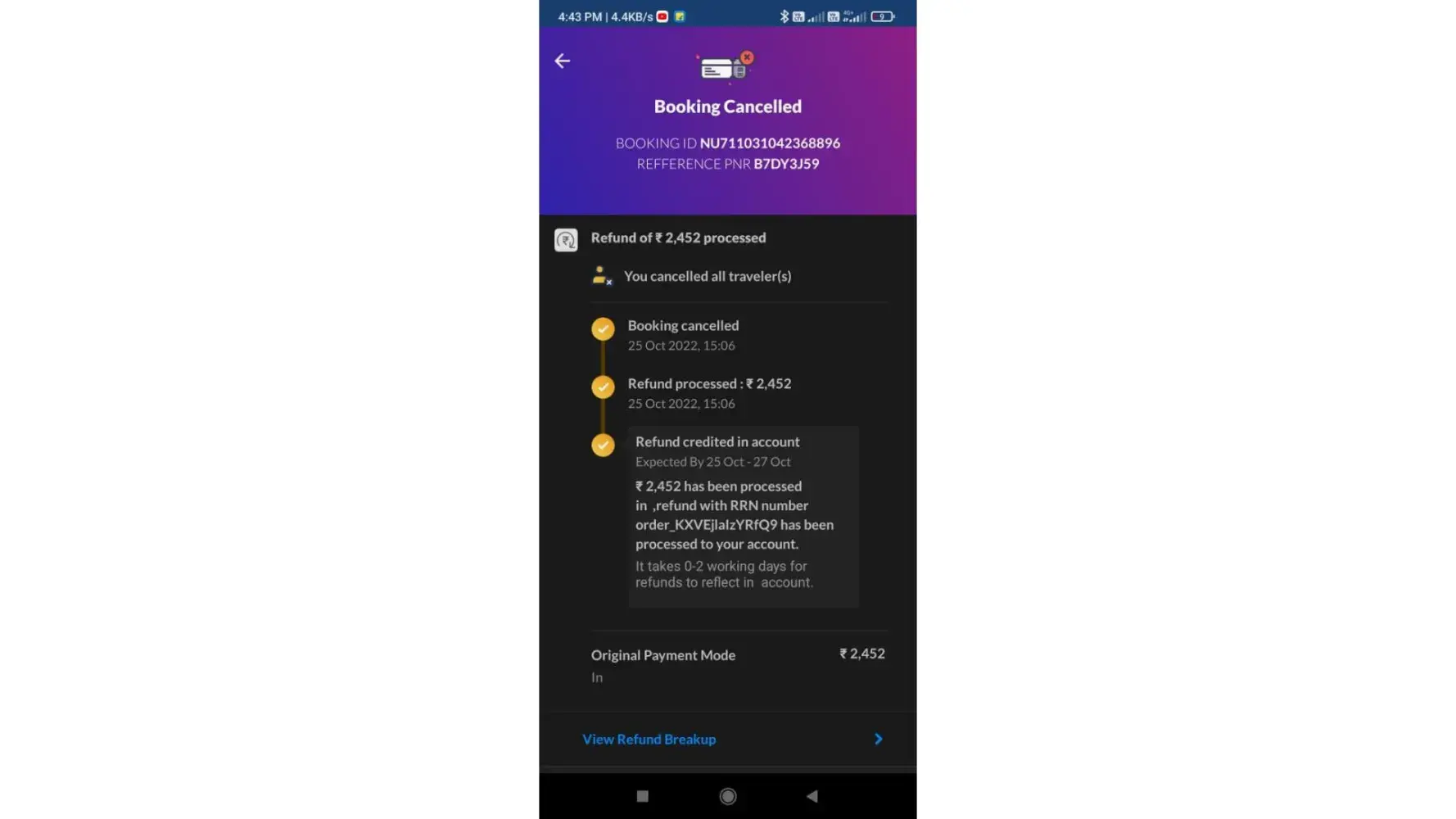 The above two refund money as detail given on cancellation of both tickets on Dt.25.10.2022 has not been credited in account.