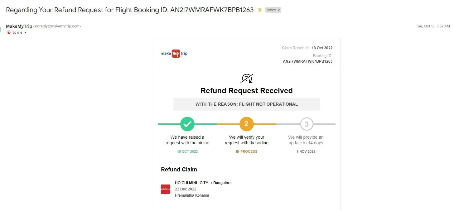 But in my Make my trip Account it reflects Zero refund.