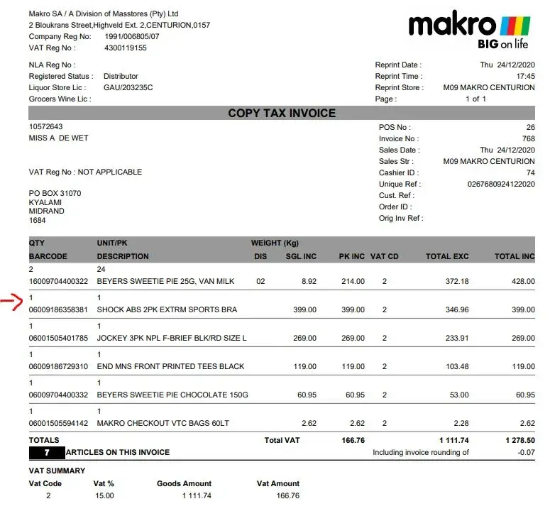 On 24 Dec 2020 I bought a 2 pack sports bra's at Makro Centurion as a gift for someone, only to find it too small for the person I bought it for. I tried to take it back today, 30 December 2020 and the return/refund was refused due to it being underwear - even though I told the lady that it was not worn - it might have looked like it as the white bra was brown from dirt when I took it from the rack on the day I bought it - perhaps something Makro should look at - I was quite shocked when I saw it myself when I got home - I did not realise it as I was in quite a rush on the day. I can understand underwear such as panties, but sports bra's being refused to return? I have attached the invoice of the sale. If you go to any other clothing shop, none of them have an issue to return bra's - it's quite dissapointing.