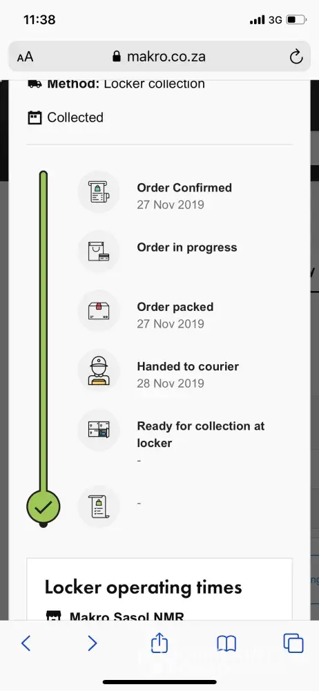 Hi AYESHA, Your order MAK2257124 is en route to Makro Makro Sasol NMR locker. You'll receive locker PIN via SMS when it is ready to collect. Track your order online. [protected]...