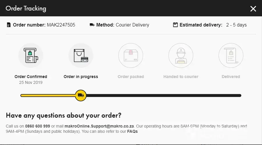 I placed an order at 07:15 AM on 27 November. It is still in Order Confirmed status, not yet in Order in Progress. I have ordered other items from two other online stores and received one within 24 hours and the other within 3 working days but not Makro?