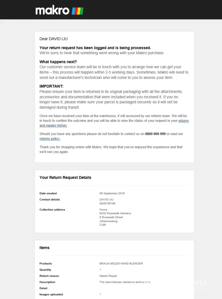I bought a Braun hand blender from Makro Online and a month later the device malfunctioned and is not working anymore. I submitted a repair request online on the 6th September. I received email confirmation for the repair request (see image attached) but over 2 weeks later, I've have received no response.