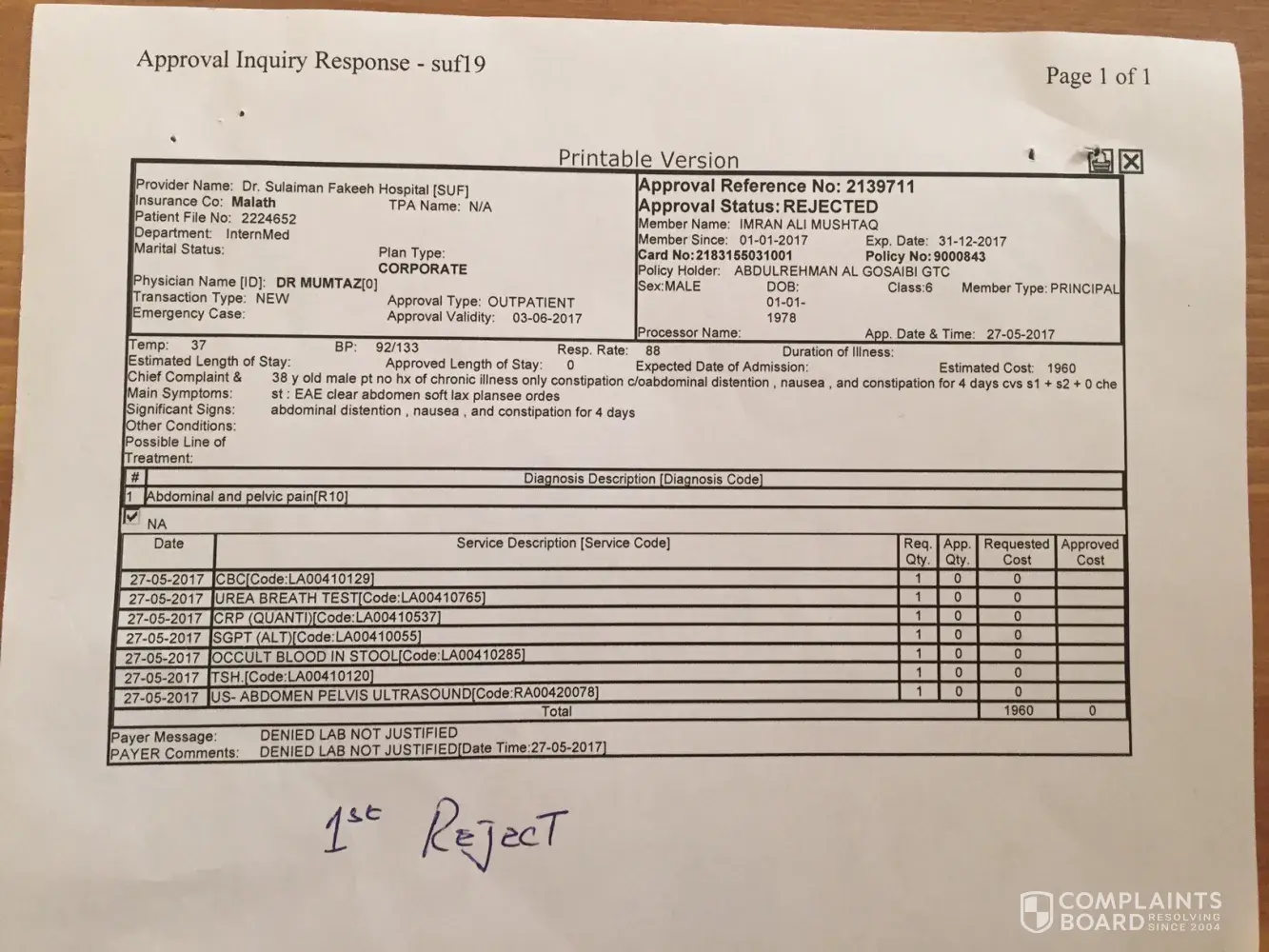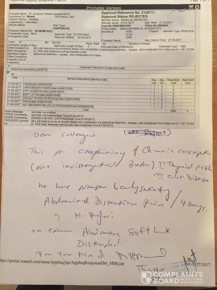 today i have severe stomach pain, Dr.Soliman Fakhee (Dr.Mumtaz) done my checkup and suggest (ultra sound And blood Test) Dr. Soliman Fakhee hospital send for approval to Malath Insurance, they rejected (reason Lab not justified) then doctor from Soliman fakhee send again with justification and they rejected again for same reason, When i CAll Malath and wants to talk to their doctor She said I cannot talk to the doctor and she Cut my phone line and then never answer..