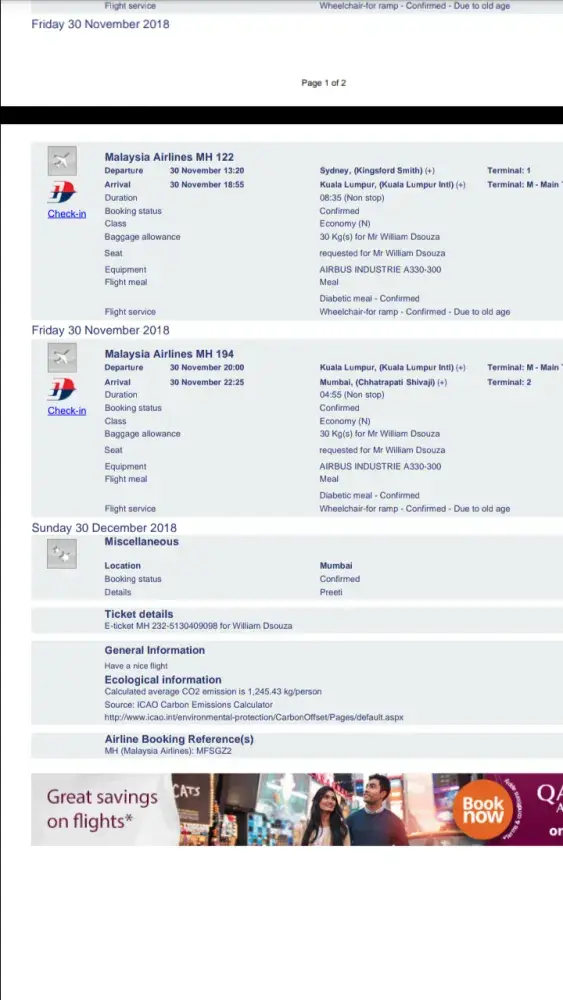 My father and I booked flights for him and his partner to visit us in Australia (Christopher de Mumm-Stanley and Elisabeth Ayling). Being that they are both elderly and require wheelchair assistance, we tried to book them a space whereby they would have some extra legroom and their mobility issues really mean they struggle in the usual economy seats. I managed to find some extra legroom seats that neither looked like they were in a exit row (as I know you need to be mobile to assist others) nor specified that they were required to be fit and able to take those seats. I am certain of this as I had found many options prior to book extra legroom and had noticed some had this requirement clause so checked very carefully when booking. The extra legroom seats costs my father an additional 200 GBP per person but they got no extra legroom on any of the flights it applied to. The flights in question were MH1 (2nd Nov 17) and MH 127 (3rd Nov 17) LHR to PER and then returning MH126 (13 Jan 18) and MH4 (13 Jan 18).