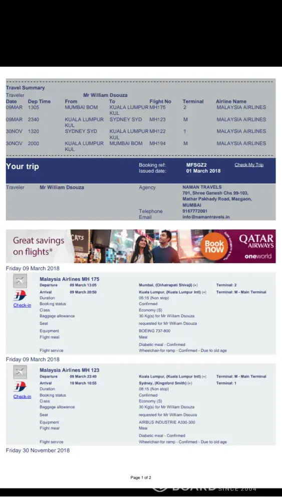 I was a passenger on flight MH-783 Bangkok to Kuala Lumpur on the 1st march 2018. Then flight MH-139 to Adelaide
