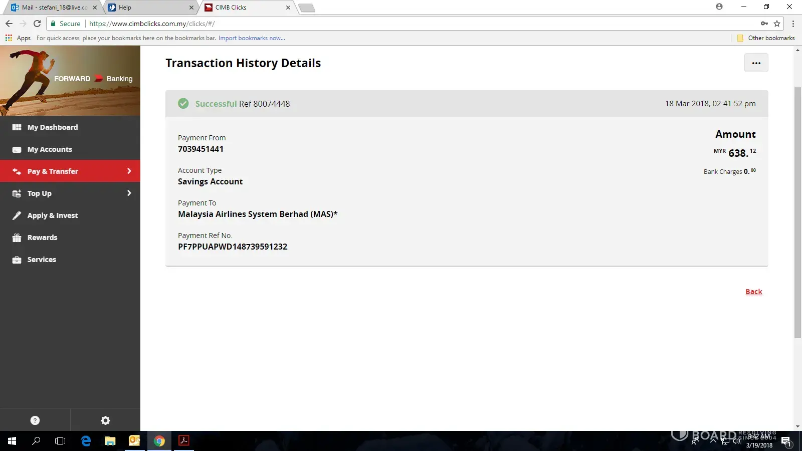I spoke to Puan Alia from CIMB Bank and she confirms that payment is successful and it is impossible for MAS to say pending payment as it is in their system that payment is successful. I again called up MAS customer service and Mr. Faizal requested me to email MAS and screenshot my payment receipt.