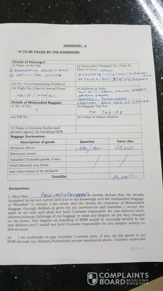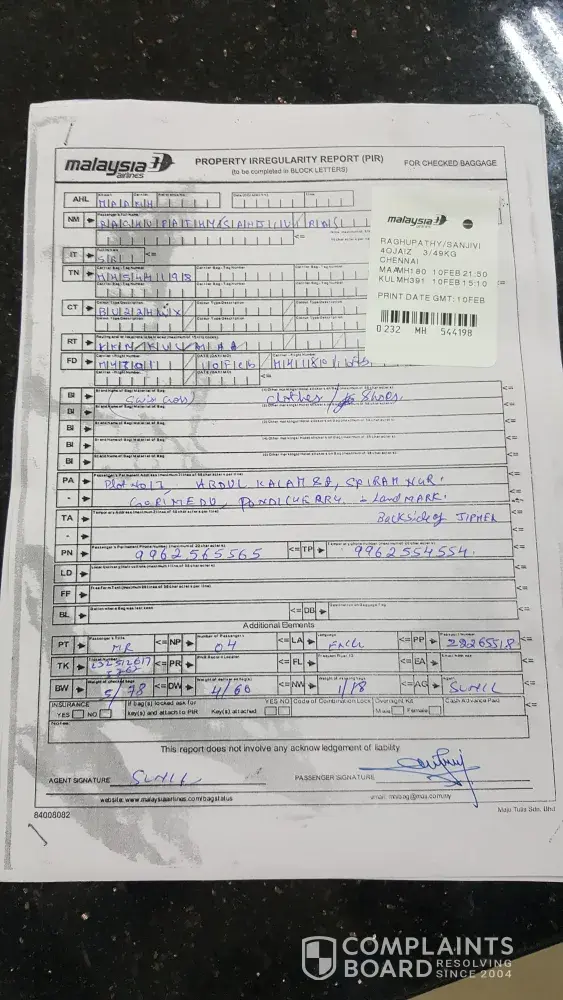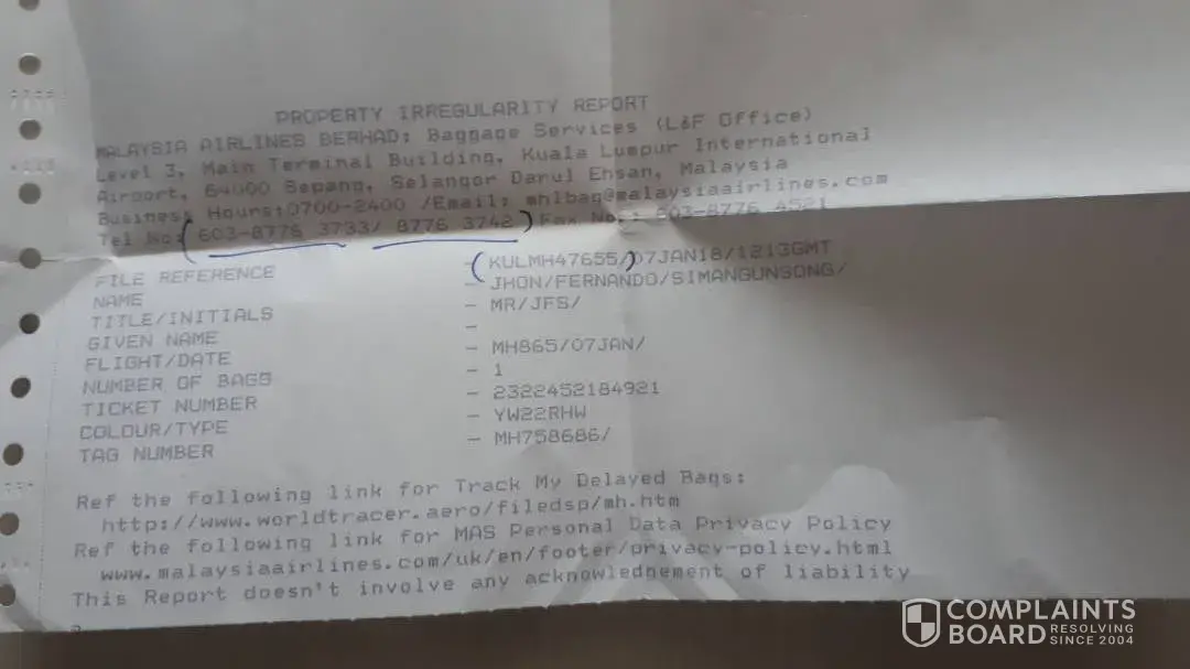 MAS ground staff assisted me with logging a complaint and a report was generated.
