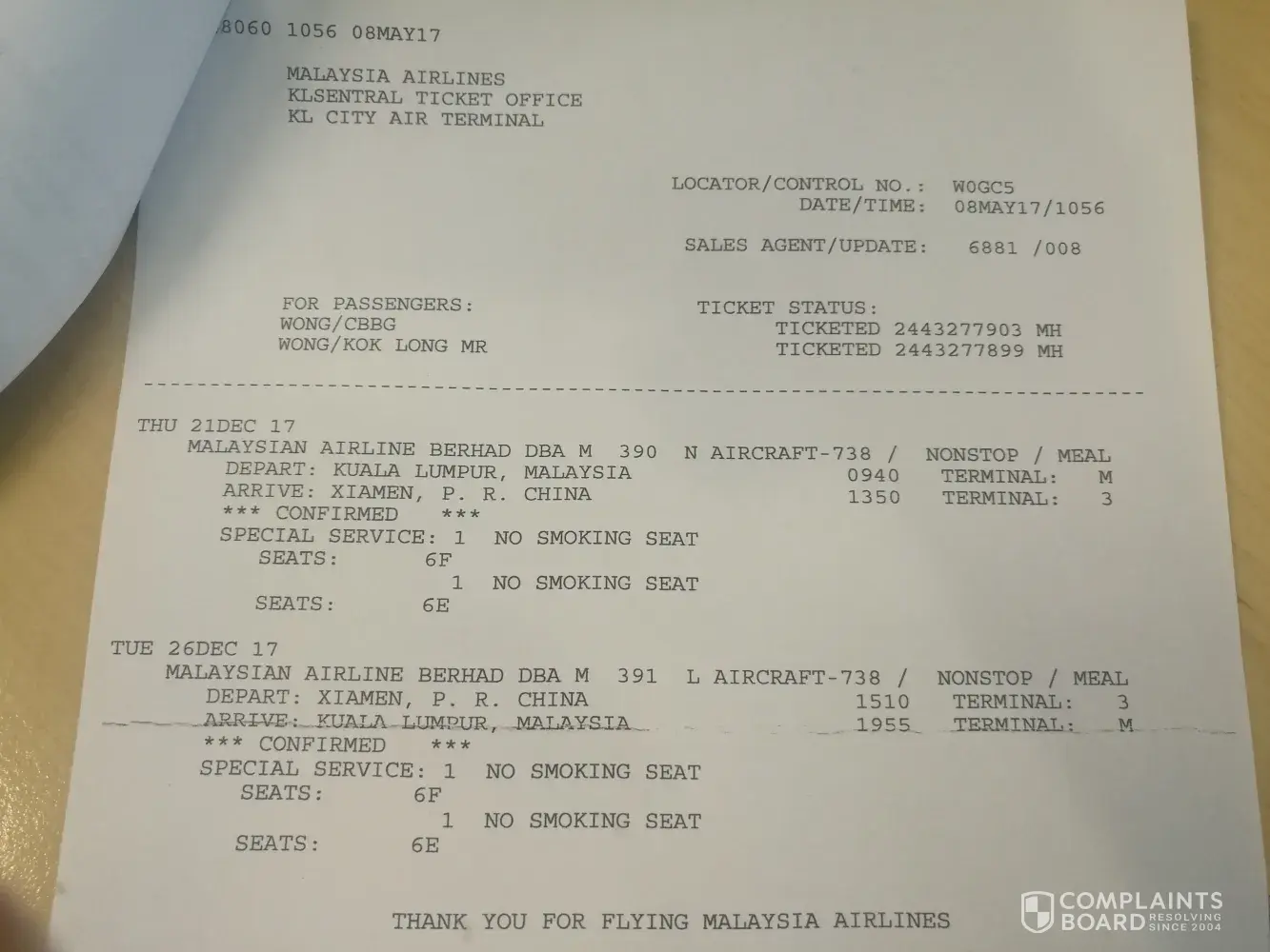 On 08/05/2017, we booked our flight. An advance booking paid for my seat 6E and 6F for both ways.