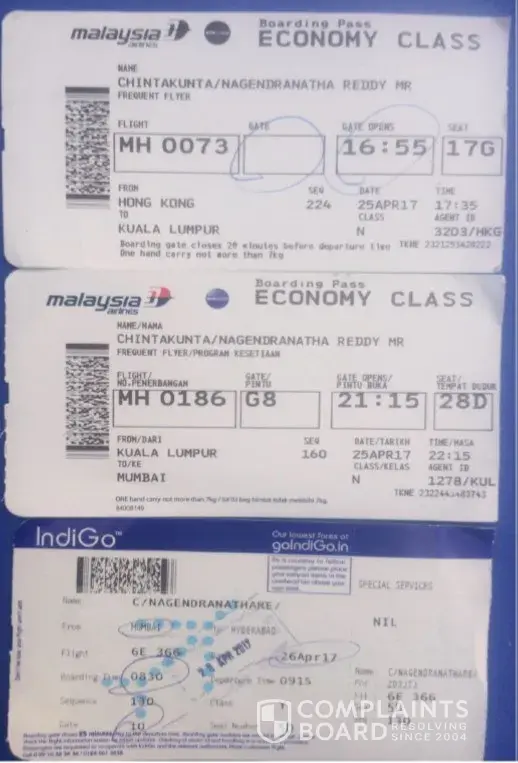 Sub: 1. Compensation for the ticket (Mumbai to Hyderabad) which I have booked inspite of confirmed ticket (From Hong Kong to Hyderabad via., Kaulalumpur) with Malaysian airlines-reg